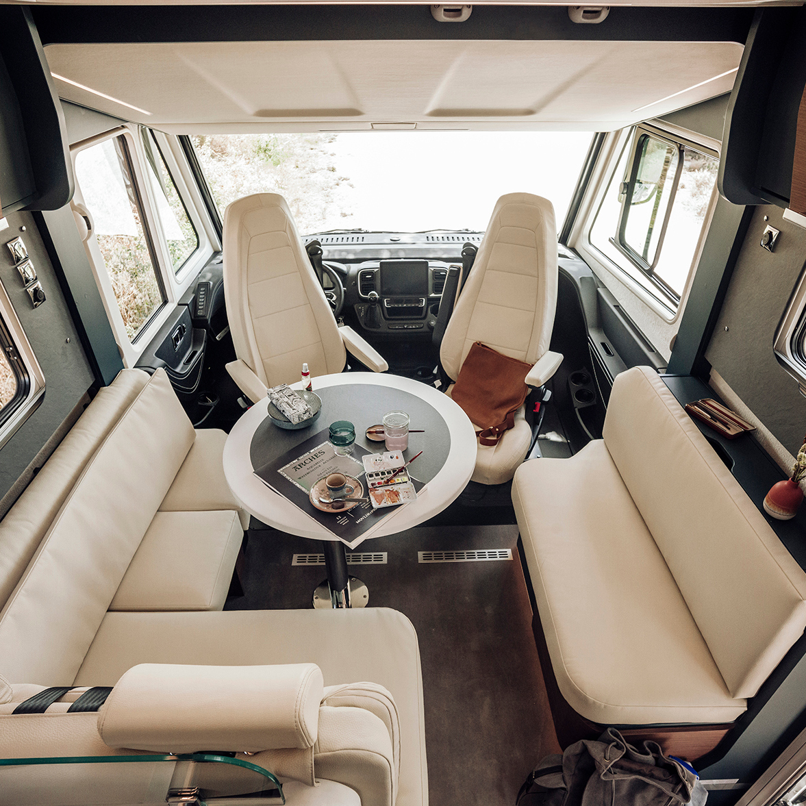 Das Kreos-Wohnmobil ist der perfekte Rahmen, um die Konzepte modernster Technologie mit ausdrucksstarkem Design zu verbinden. Es dient als gemeinsamer Boden, auf dem der Camper zu einem Ort wird, an dem man sich auf ganz natürliche Weise ausdrücken und begeistern kann.