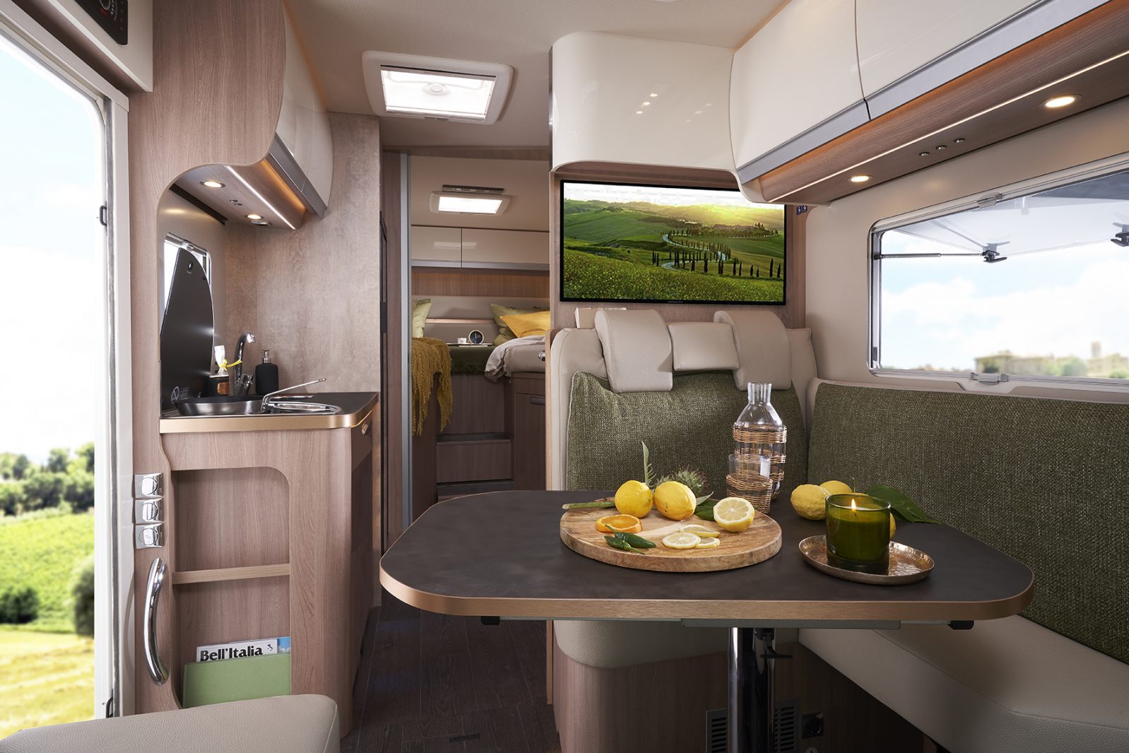 Dass die Ecovip-Reihe immer für eine Überraschung gut ist, zeigt der Blick in den neuen Ecovip L 3009. Bei einer Gesamthöhe von stattlichen 2,96 Metern – die Standhöhe misst komfortable 2,10 Meter – kommt der neue Teilintegrierte auf eine kompakte Außenlänge von 6,99 Metern. Auf einer Breite von angenehmen 2,25 Metern hat der L 3009 zwei Schlafplätze, zwei weitere sind optional möglich. Der Wohnraum mit L-förmiger Essecke und großem Seitensofa bietet viel Freiraum und fünf Sitzplätze am Tisch. Auf der kompletten Fahrzeugoberfläche ist der Doppelboden durchgehend. Entertainment kommt an Bord nicht zu kurz. Das TV-Fach ist passend für einen 32-Zoll-TV-Screen, der auch ganz bequem vom Hubbett aus gesteuert werden kann.