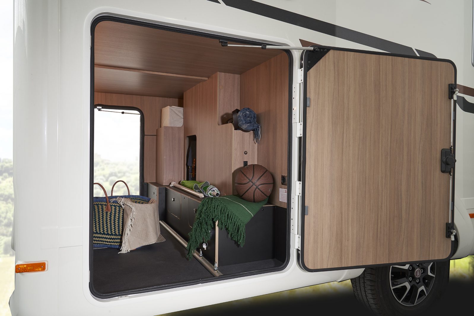 Innovativ geht’s auch im Badbereich zu. Die neue multifunktionale Toilette verfügt über eine separate Komfortdusche. Der Clou ist die WC-Tür – dank doppelter Verwendung. Für ein Höchstmaß an Privatsphäre kann das Badezimmer abgetrennt, zudem der Zugang zum hinteren Schlafzimmer geschlossen werden. Beim Blick dort hinein fallen die großen, komfortablen Einzelbetten auf, die sich im Handumdrehen zum Relaxen und Schlafen in ein Maxi-Doppelbett umfunktionieren lassen. Optional kann das Doppel-Hubbett elektrisch in der Höhe verstellt werden. Platzsparend ist die Doppelbettstufe, die einziehbar ist. Ausziehbar ist der große Kleiderschrank, in den jede Menge Hosen, T-Shirts und Kleider passen. Damit E-Bike, Surf-Board und Gartenstühle mitreisen können, wurde die Maxi-Garage mit 250 Kilogramm Zuladung und niedrigem Ladungs-Niveau konzipiert – sie ist bequem von außen über die doppelte Zugangstür erreichbar, beheizt und isoliert.