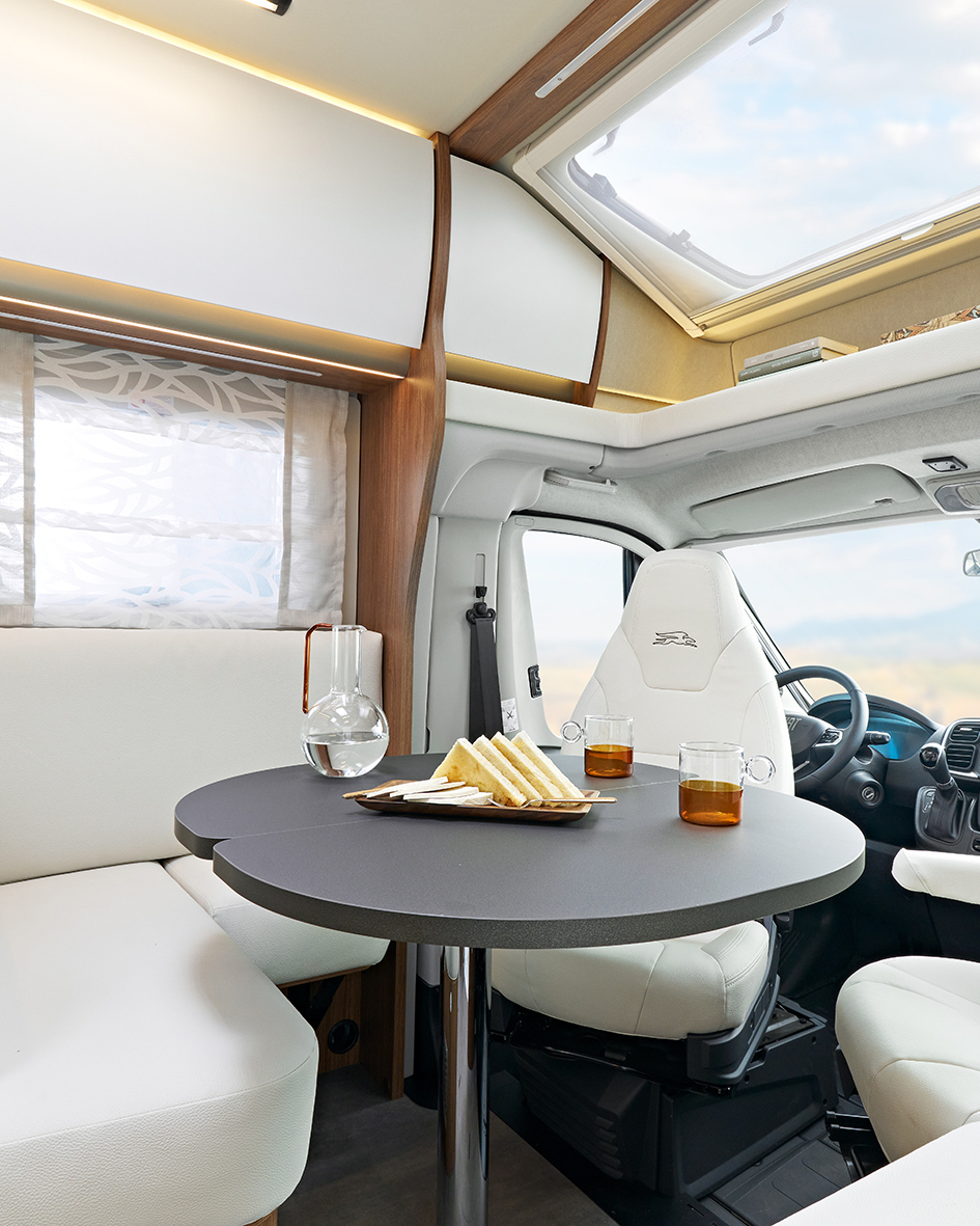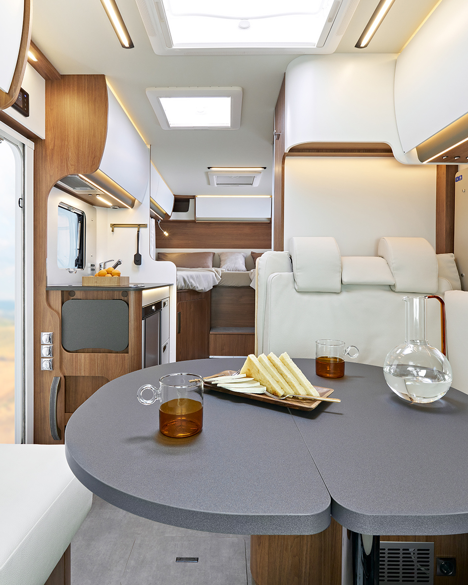 Im Essbereich steht der ergonomische Tisch mit verschiebbarer, schwenkbarer und erweiterbarer Platte bereit, um sowohl ein Familienessen als auch einen kleinen Snack komfortabel zu ermöglichen. Während draußen die Landschaft vorbeizieht, vermitteln innen sämtliche Materialien, Gewebe und Oberflächen ein Gefühl von Sicherheit und Geborgenheit – ein Zuhause, wo immer Sie sich befinden.