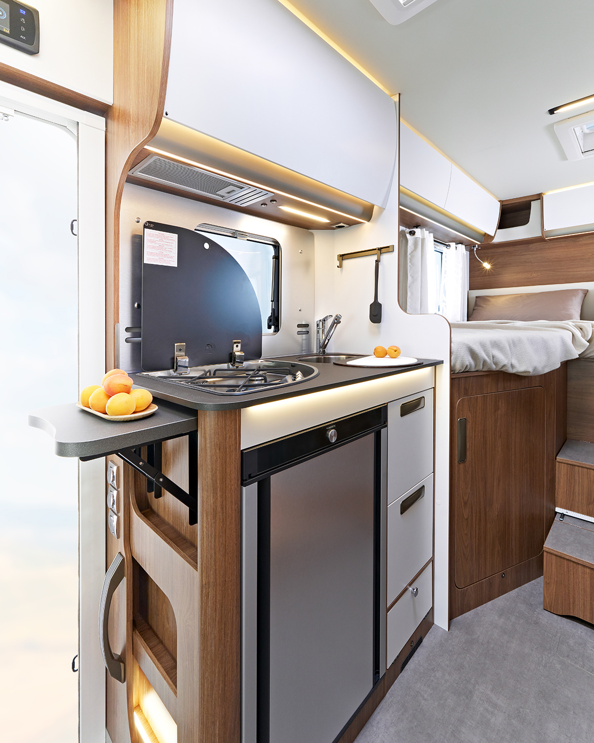 Die warmen Töne der Möbel in Noce Opèra, die sanfte Haptik des Firenze-Kunstleders und die LED-Beleuchtung, die jede Ecke umspielt – all das lädt ein, zur Ruhe zu kommen, tief durchzuatmen und den Moment bewusst zu genießen. Die Küche verbindet Eleganz und Funktionalität: ein Dreiflammherd, eine robuste sowie samtige Fenix-Oberfläche und ein Edelstahlspülbecken mit Mehrzweckabdeckung.