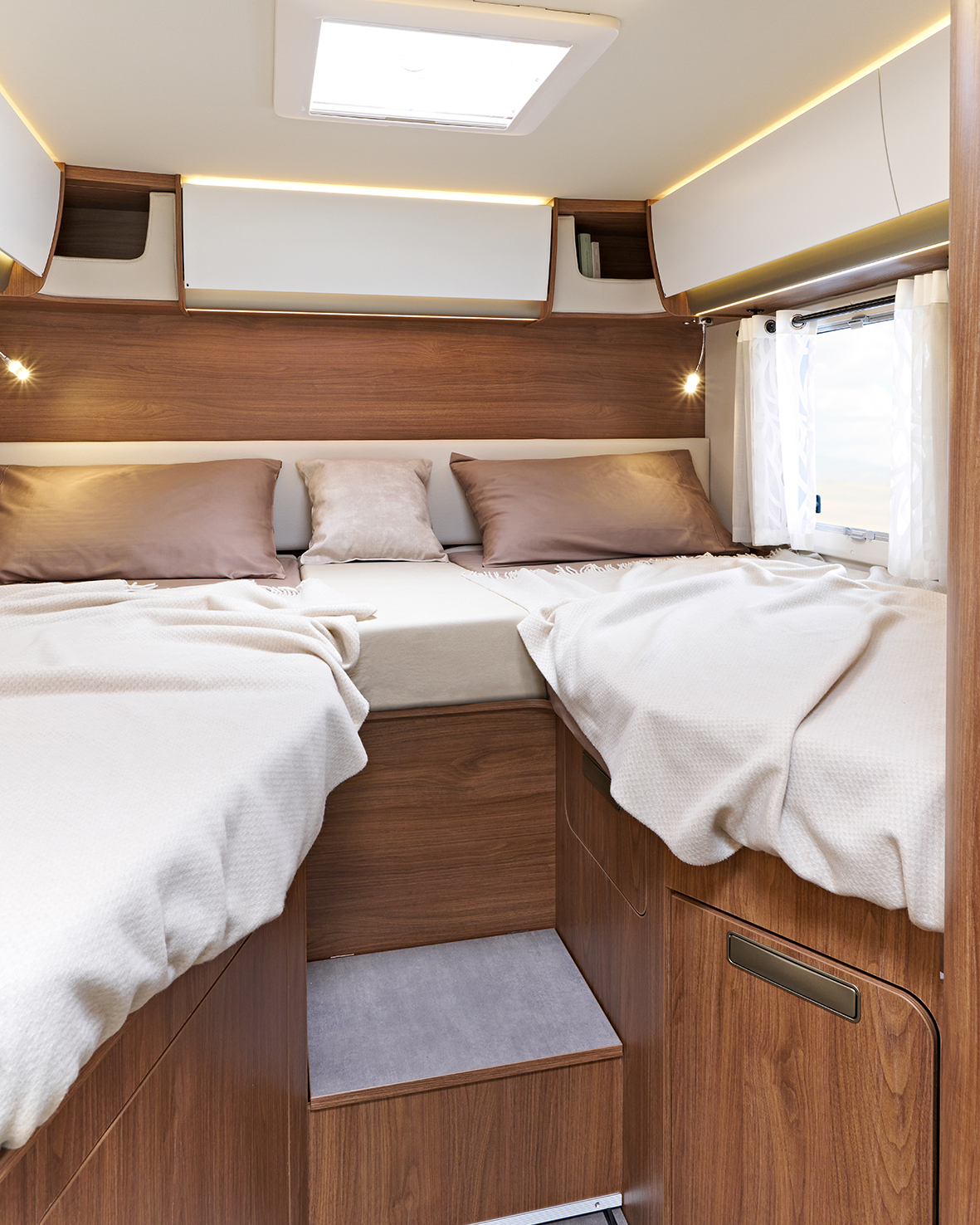 Biolatex-Ergonomiematratzen, Lattenroste, Kunstleder-Kopfstützen und Verdunkelungsvorhänge – hier bleibt nichts dem Zufall überlassen. Das vordere Hubbett ist für alle Modelle optional verfügbar und bietet den Komfort eines vollwertigen zweiten Schlafzimmers.