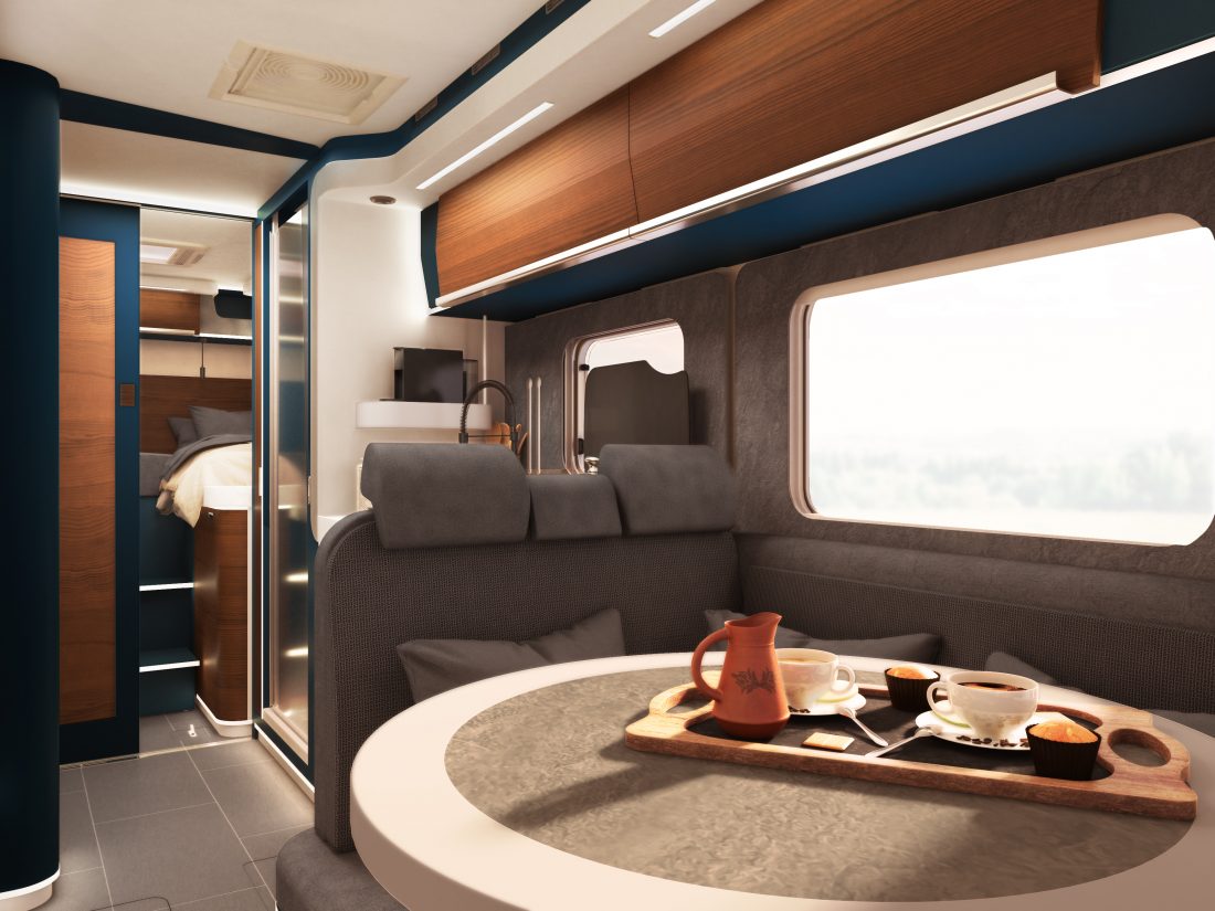 Interiøret er designet ned i mindste detalje for at skabe et luftigt og lyst miljø med plads. Udover Skyview med panoramaudsigt er den nye Kreos udstyret med et elektrisk soltag (96 x 65,5 cm), som også kan bruges under kørsel (valgfrit som alternativ til sænkesengen). Der er masser af naturligt lys og frisk luft i hvert rum. Er man til sofistikeret design og møbler, vil man ikke blive skuffet. Møblerne har et unikt strejf af klasse med ægte trælåger, der giver rummet en stilfuld, men naturlig atmosfære. Bodelen er et rum til deling. Her er plads til op til syv personer under ophold, også takket være det nye system til konvertering af sæderne i kørselsretningen, som giver en ekstra plads i dinetten. Det er noget helt særligt at spise med venner omkring det elegante runde bord. Hele rummet er designet til afslapning, måske foran TV’et på 32″ (tilvalg) med elektrisk betjent bevægelsessystem, der er synligt både fra sænkesengen og bodelen: maksimal komfort, ligesom i en rigtig suite.