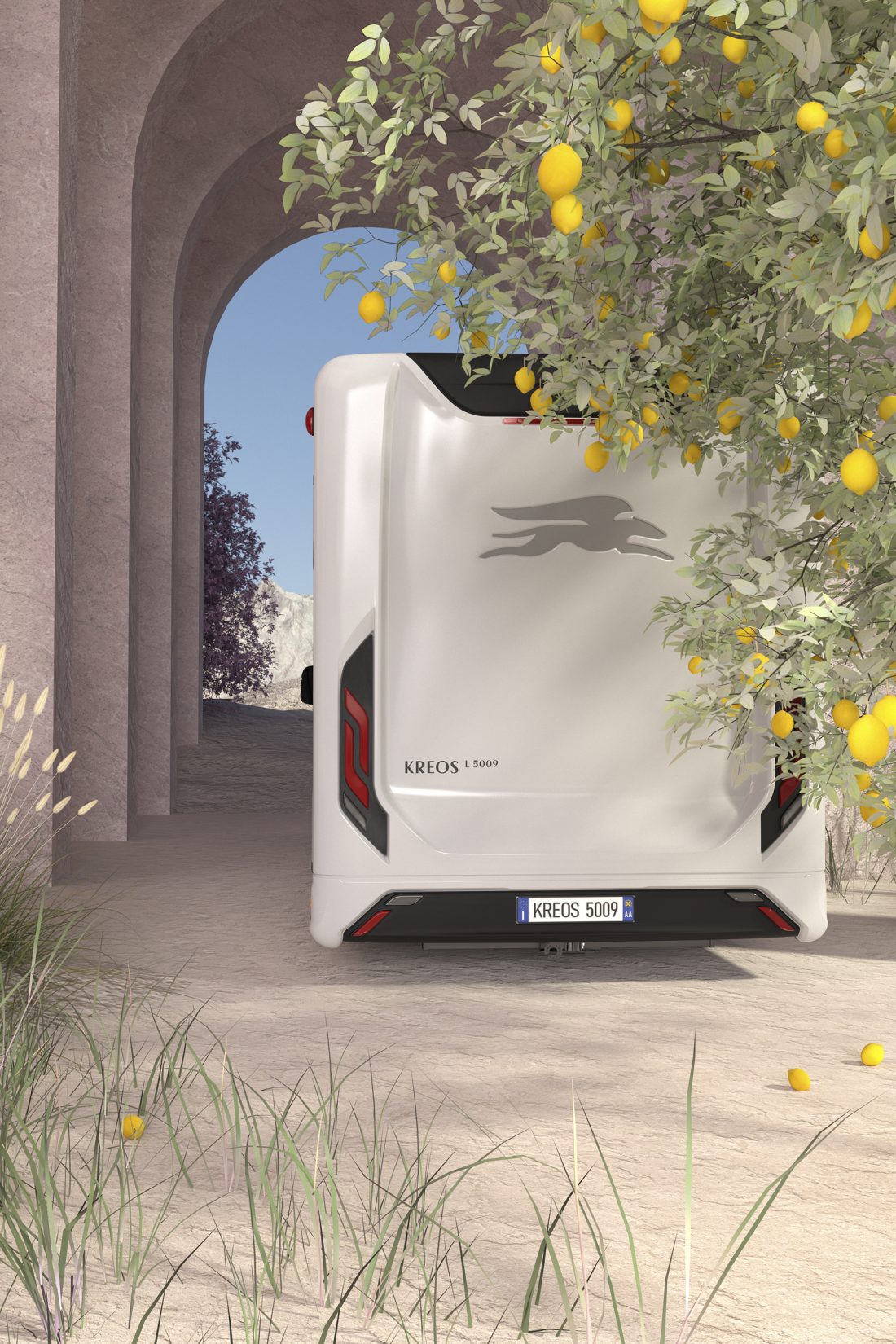 At køre den nye delintegrerede Kreos er en uforglemmelig oplevelse: Fiat AL-KO Heavy-chassiset giver kørekomfort, stabilitet og sikkerhed. Den elegante glasfiberkuppel med stort Skyview (116 x 73,5 cm) giver et optimalt naturligt lys og er fuldt isoleret, samtidig med at den sørger for, at der kan komme frisk luft ind. For at sikre styrke og stabilitet selv under de mest udfordrende vejrforhold er bagvæggen og taget i ét stykke også lavet af glasfiber. Karrosseriets samling med direkte væg-til-tag- og væg-til-gulv-forbindelse giver Kreos et lineært og harmonisk udseende, men frem for alt en fremragende isolering og meget høj mekanisk modstand. Apropos udseende, så er de ultraflade bilruder med aluminiumsrammer ikke kun holdbare og af høj kvalitet, men også skønne at se på.