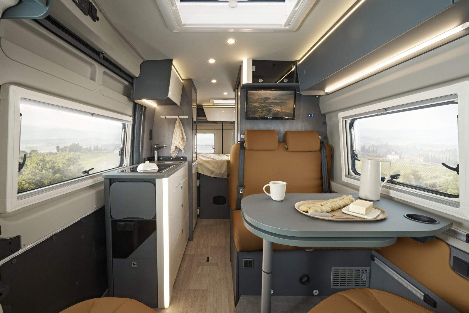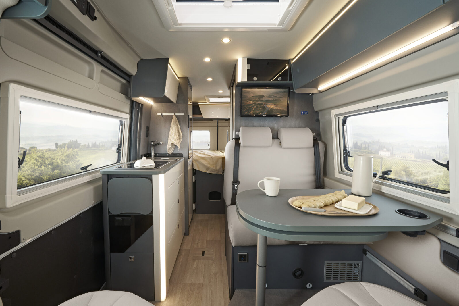 Naturligt lys følger dig hele dagen takket være et stort panoramavindue med kipfunktion i opholdsrummet og strategisk placerede vinduer langs hele køretøjet. To frontåbninger betjener siddegruppen og køkkenet, et sidevindue lyser badeværelset op, mens to vinduer er dedikeret til bagenden. Ønsker du endnu mere? Som tilvalg giver det integrerede Skyview i førerhuset en fantastisk udsigt til himlen og gør hver rejse til en panoramisk oplevelse.