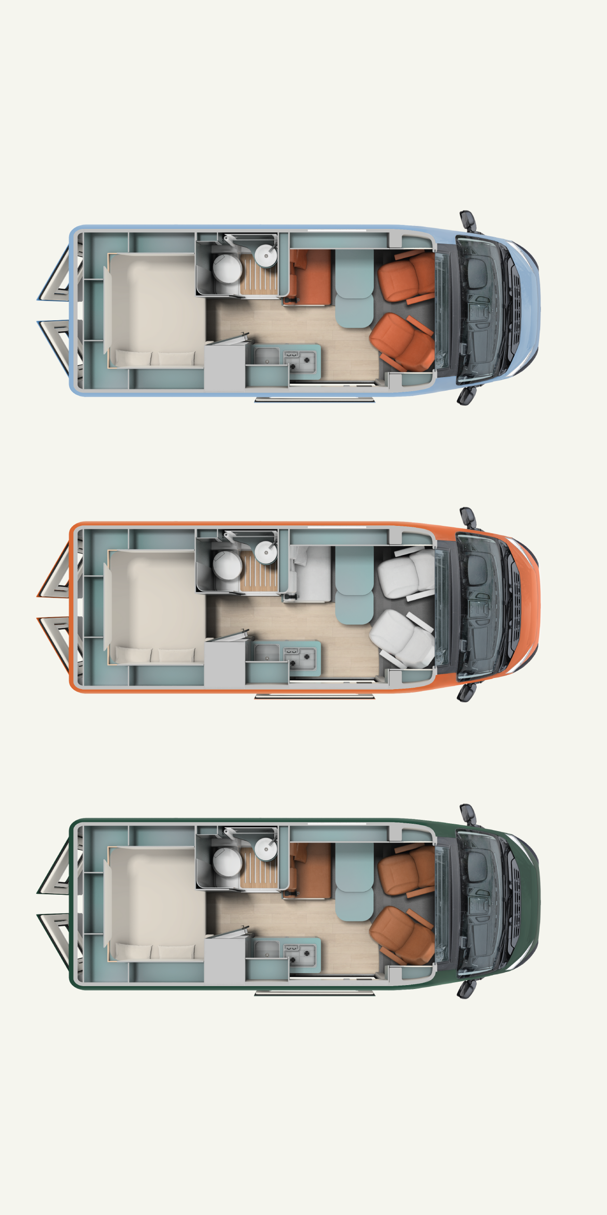 Karrosseriet følger hovedfarven i den valgte version, med frontgrillen i metallisk grå og sidelister i Black Matte, som afspejler Kosmo-seriens fællestræk. Men det er kombinationen af detaljer, der definerer Kosmo Supremos identitet gennem en æstetik inspireret af racerbilernes verden – fortolket med elegance i en campervan-kontekst.