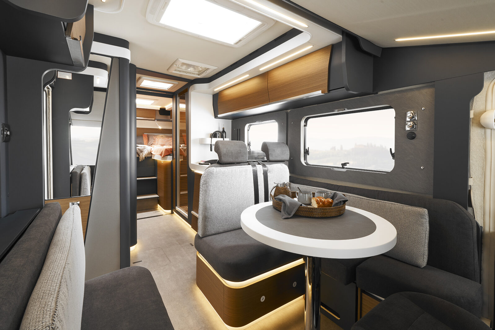 Starting with the automotive-inspired fibreglass single-block front, and continuing with the iconic layout of the Kreos range: here, the elegant GetaCore surfaces (an anti-fingerprint and scratch-resistant material), the spring-suspension system beds and the wellness shower contribute to creating a cosy and refined ambience, offering all the comforts of a real suite on four wheels.
