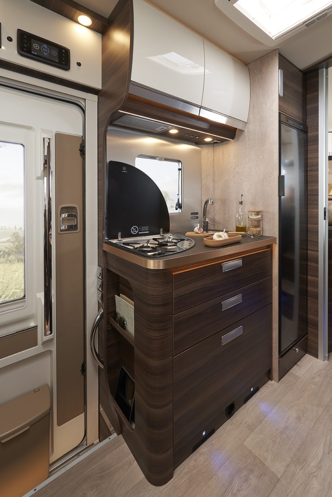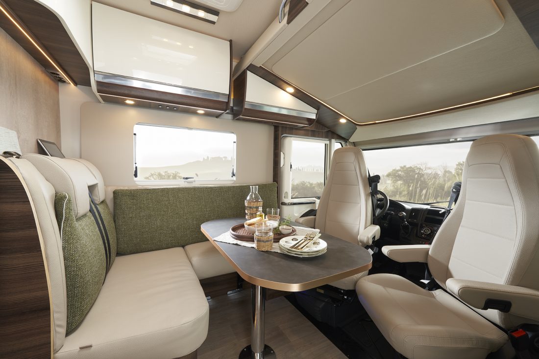 Entirely designed in San Casciano, the motorhome is elegant and with an automotive feel, fibreglass front panel and panoramic windscreen, daytime running lights and car-like headlights with dynamic direction indicators. The XL living pod door allows easy and practical access. Inside, the rounded curves of the furniture embellish the living space and hint to the rolling landscapes of Tuscany. There are two styles are available: the standard Moka with warm brown tones and golden shades or the lighter Pero Toscano (optional). The wood can be paired with a wide variety of fabrics. The seats can be freely matched with the cushions to customise the ambiance. Comfort is guaranteed in the living area by a single level floor for free and easy movements throughout the vehicle. The table with chrome leg can be moved in all directions to ensure the best comfort in all situations of use. For watching your favourite TV shows on the road, the TV compartment in the living area can accommodate LCD/LED screens up to 32″ in size. The wall units with generous doors have elegant chrome-plated metal ergonomic handles (a Laika exclusive) and integrated uplighting.
