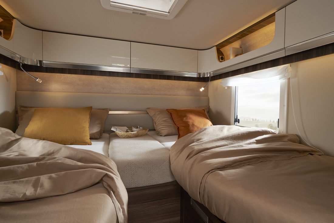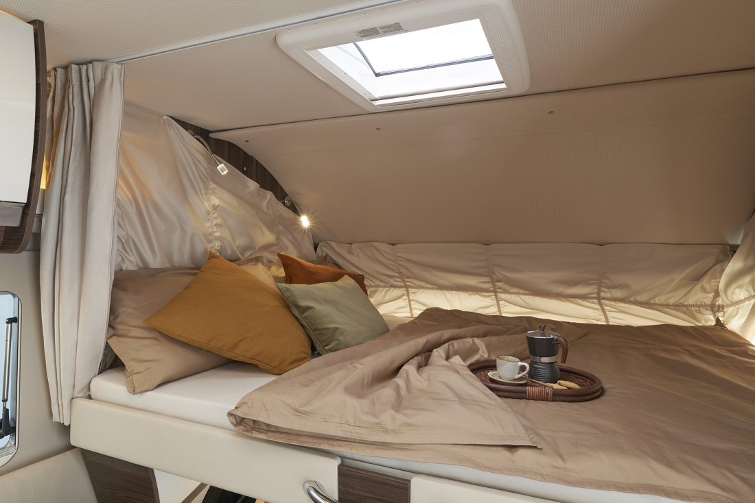 The pull-down bed, standard on the entire range, is fully integrated into the wall units and provided with a comfortable slatted frame, high-quality mattress, adjustable reading lights, USB ports and roof portholes. In the sleeping area, the day/night separating door secures total privacy and the twin beds (197 × 82 cm / 192 × 82 cm) are remarkably comfortable. The wardrobe with hangers is designed for practical and tidy use, just like at home.
