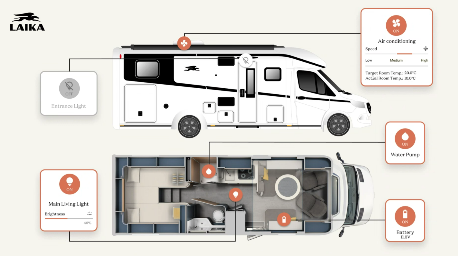 The motorhome will monitor conditions and then decide which functions to activate for a relaxing evening or a great start to the day. Once the setup has been created and activated, the MyLaika app will perform all the functions required, such as switching on the light, activating the heating system and extending the satellite dish.