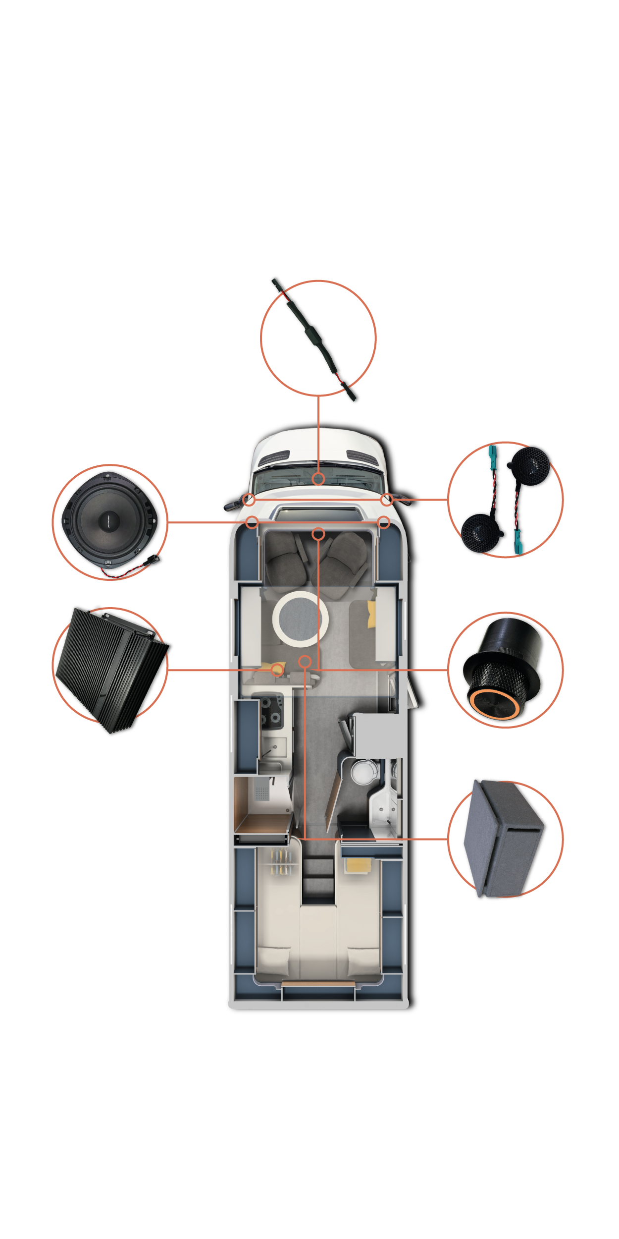 Moreover, thanks to the connection to the vehicle’s service battery, the system can be used even when the vehicle is stationary – perfect for accompanying a relaxing break or an evening under the stars.