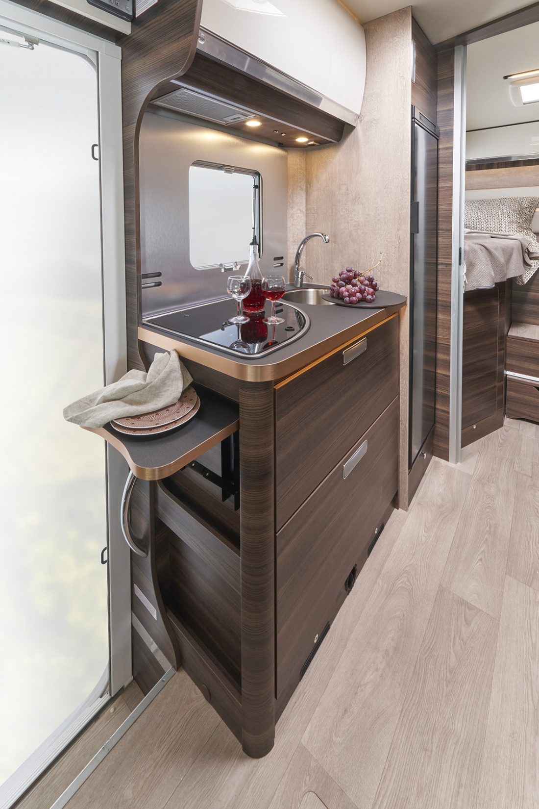 Le revêtement des surfaces de la table, de la cuisine et du lavabo en Fenix (présent également sur le camper van Ecovip), un matériau très résistant aux rayures et à l’abrasion, améliore le confort à bord et offre une solidité et une valeur durables.