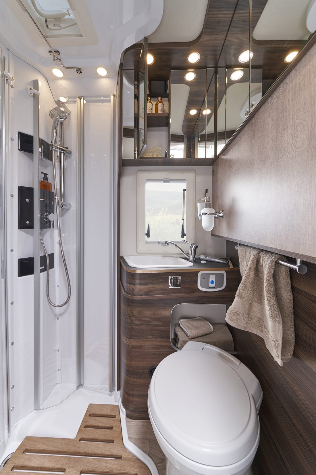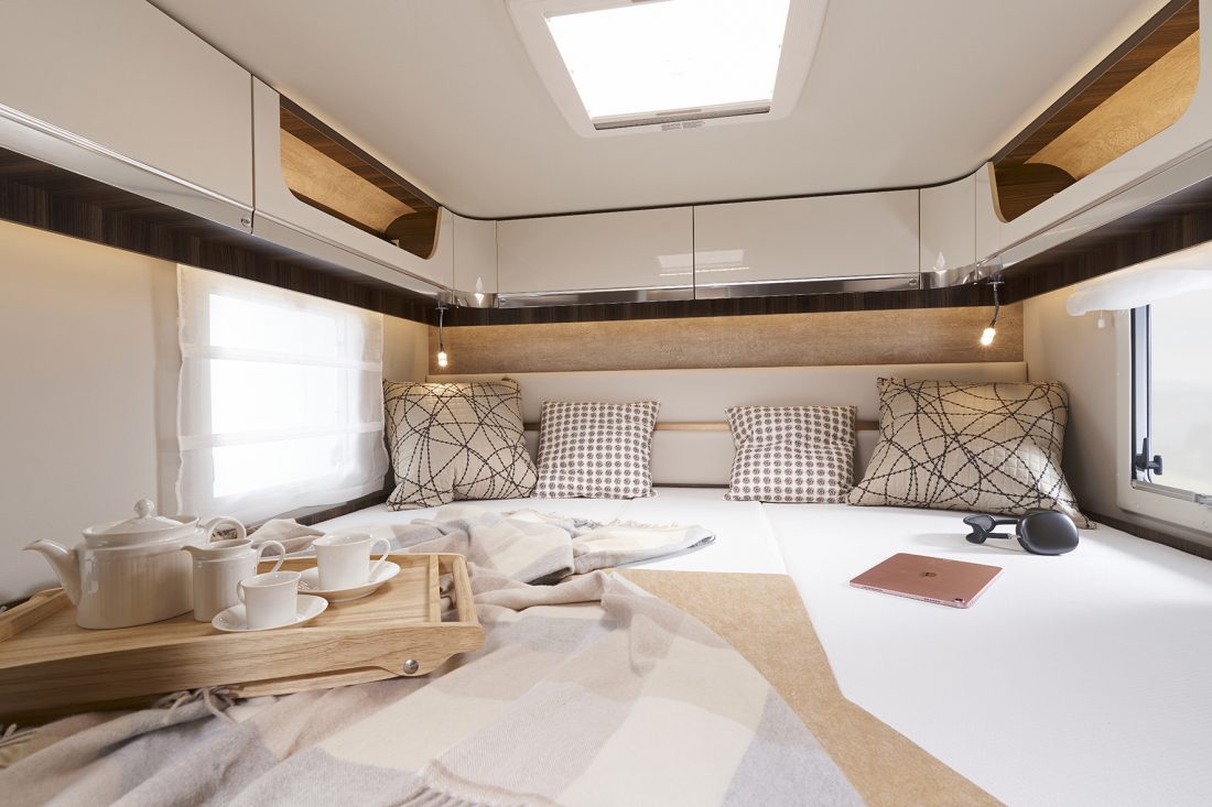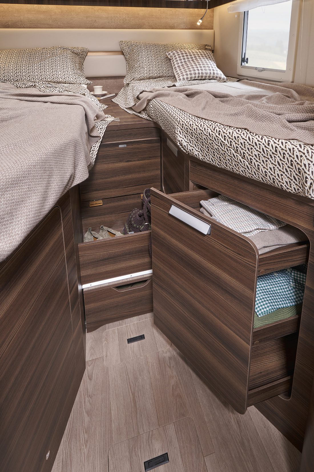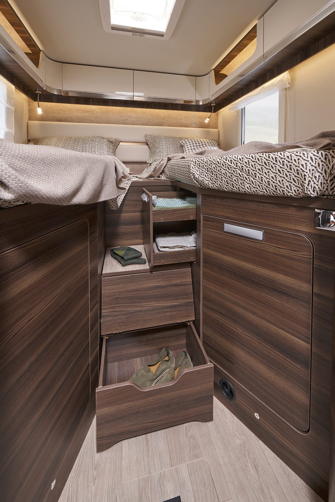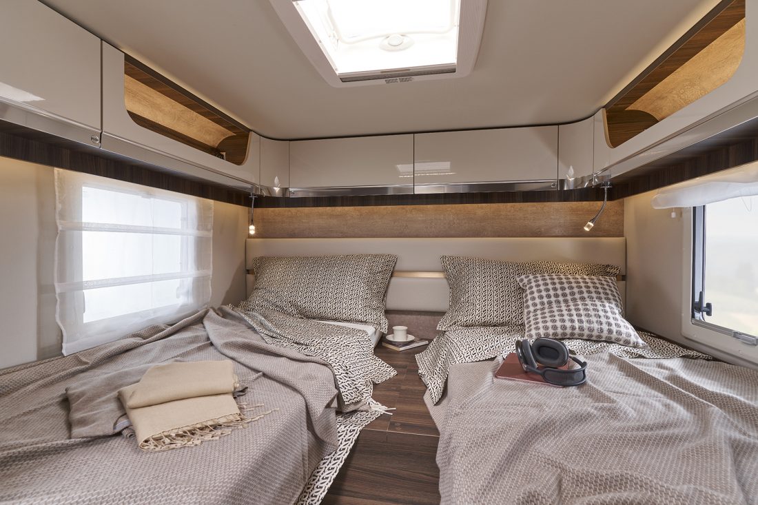 À bord d’un Ecovip, ranger devient aussi un vrai plaisir : les portes des placards de pavillon ont été équipées de charnières réglables et d’un système d’ouverture par pression (au lieu de poignées) pour un accès pratique à tous les compartiments intérieurs du véhicule. Les modèles à lits jumeaux disposent également de nouveaux éléments ultra profonds qui ornent les parois, offrant de nombreuses possibilités de rangement.