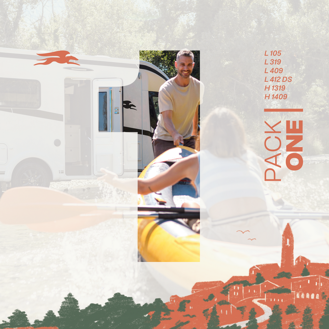 La versione Pack One – Kosmo H viene proposta di serie per i modelli Kosmo Motorhome H 1319 e H 1409 e presenta i seguenti accessori: