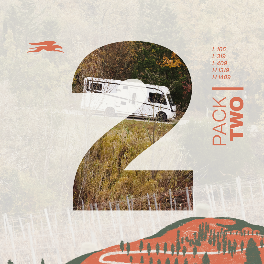 Il Pack Two offre un sistema multimediale Pioneer di ultima generazione, una batteria al litio da 150Ah e un pannello solare da 120W con regolatore e piedini di fissaggio. Questo pacchetto, disponibile per tutti i Kosmo Profilati e Motorhome ad eccezione del modello Kosmo L 412 DS, consente di affrontare viaggi prolungati con maggiore autonomia e intrattenimento a portata di mano.