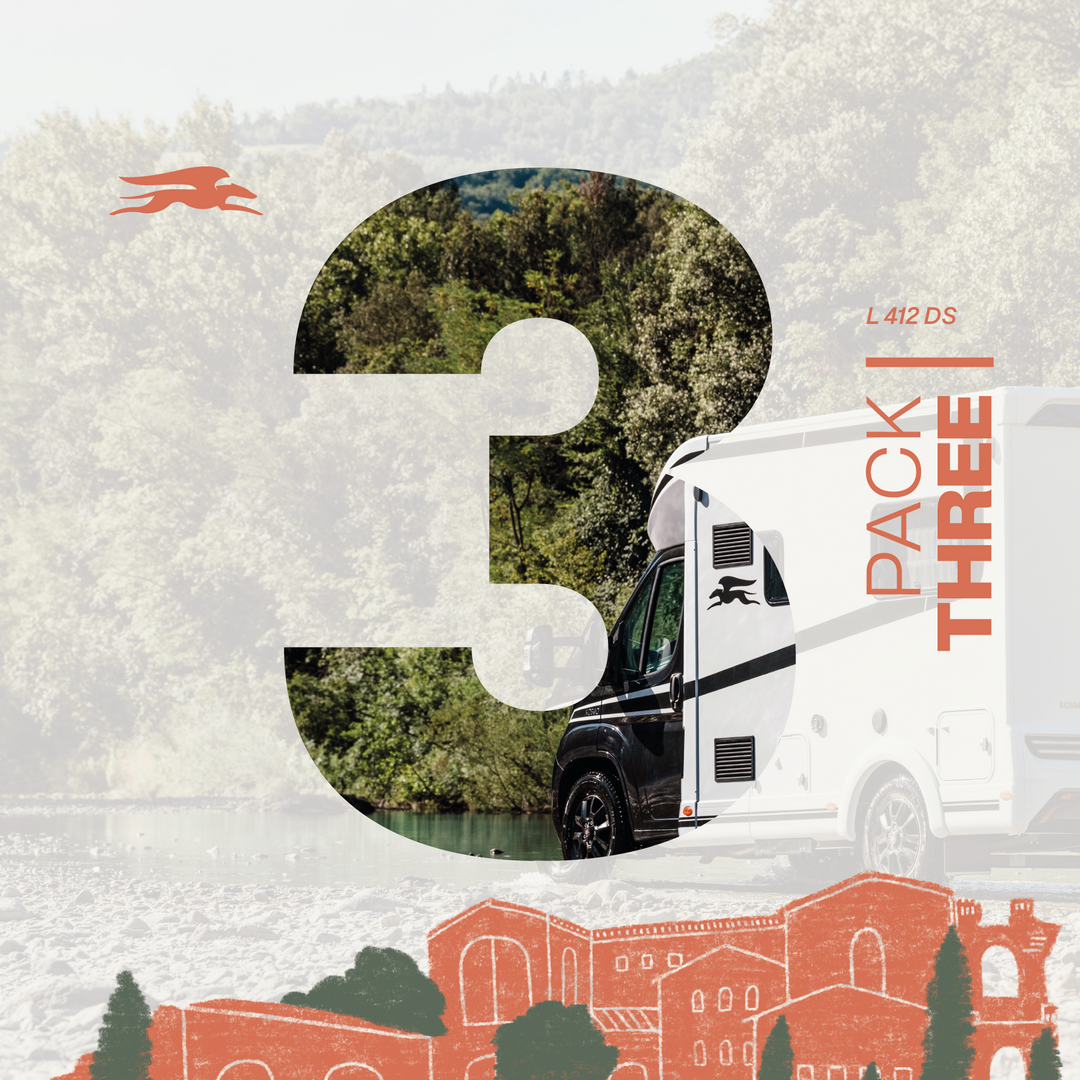Pensato per il modello Kosmo L 412 DS, il Pack Three include tutti gli accessori del Pack Two e aggiunge un letto posteriore elettrico regolabile in altezza, che offre flessibilità nell’uso dello spazio interno e comfort personalizzato per ogni esigenza.