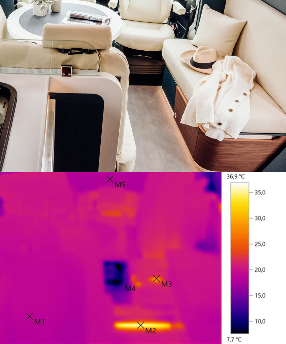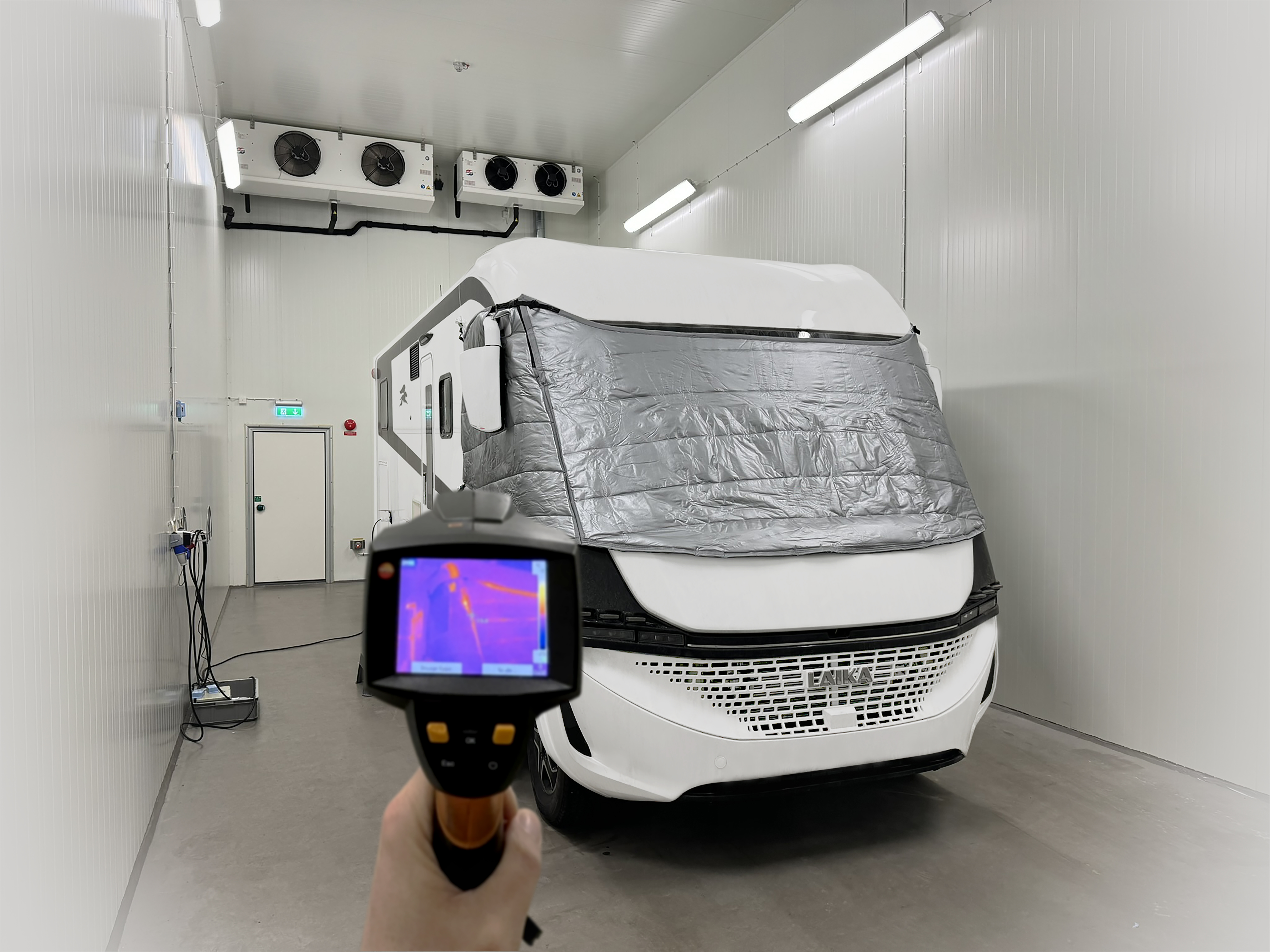 Om de test uit te voeren, werd de kampeerauto ‘s nachts in de klimaatkamer geplaatst, met deuren en ramen open, bij een stabiele temperatuur van -15°C. De volgende ochtend werd de kampeerauto aangesloten op het elektriciteitsnet en de verwarming aangezet om de kamer op de gecontroleerde temperatuur te houden. Het verwarmingssysteem bleef aan tot de temperatuur van de referentiesonde 35°C boven de buitentemperatuur kwam.