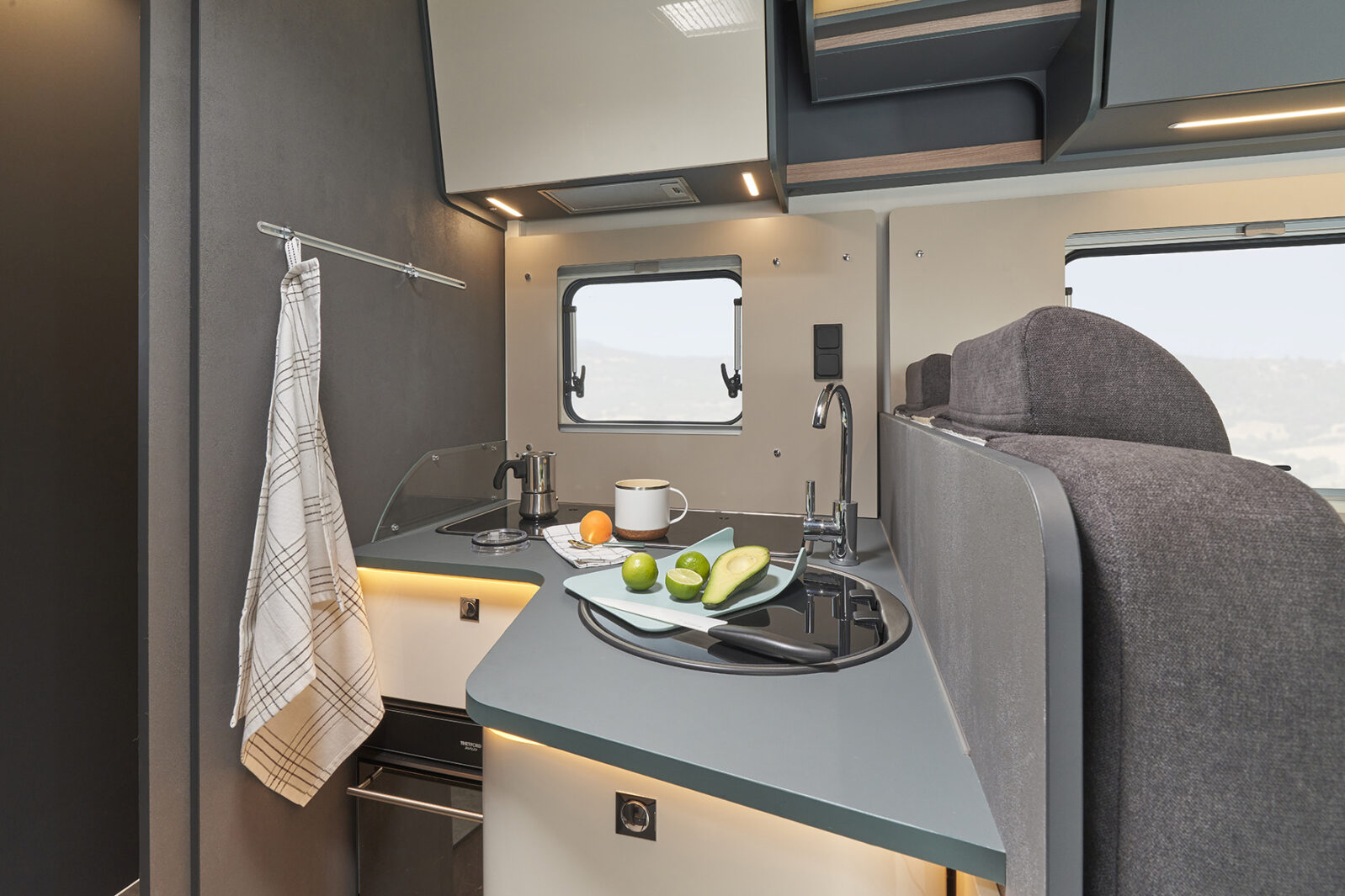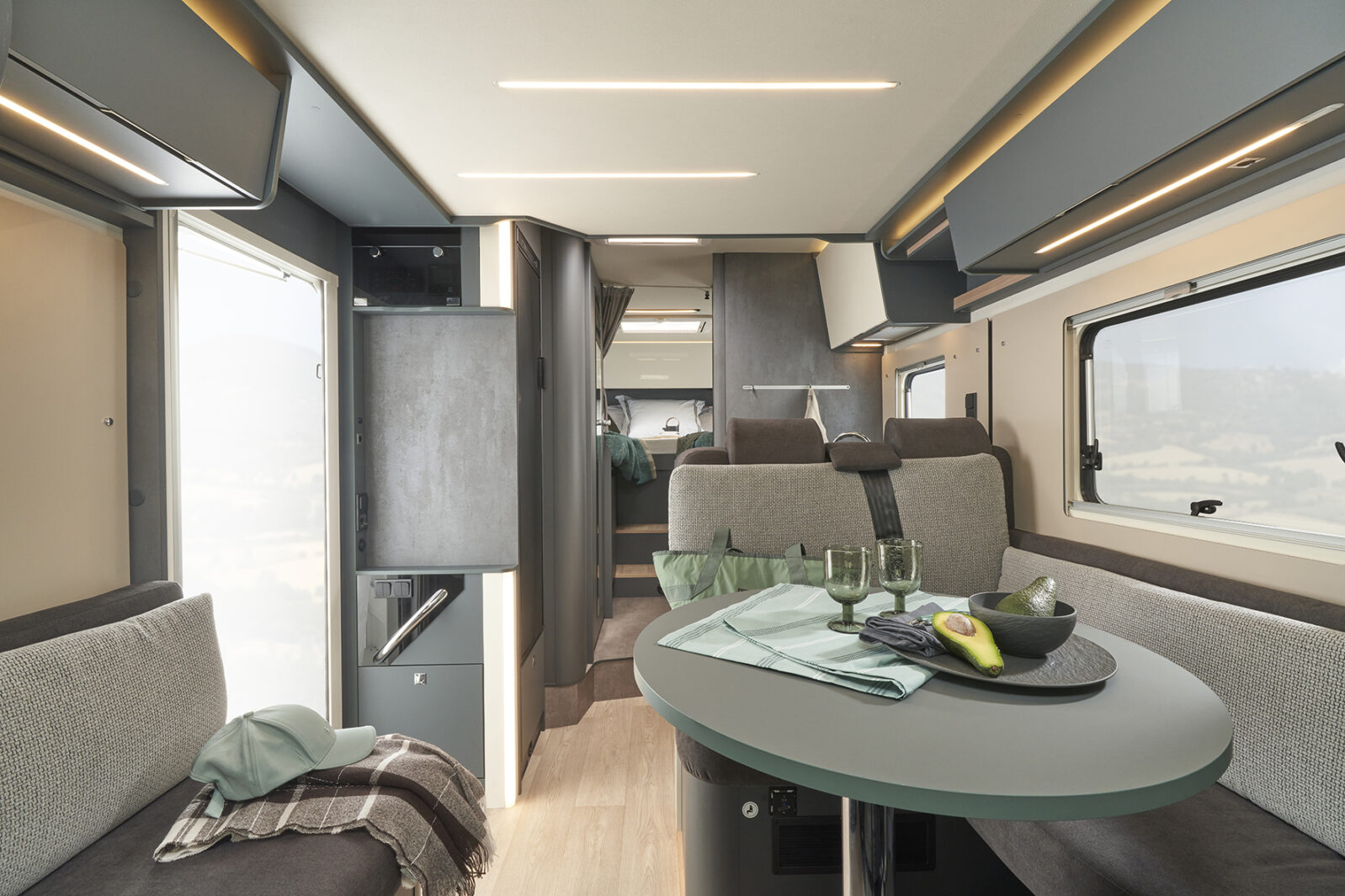 The modern, ergonomic shapes of the new Kosmo range feature striking elements such as spacious wall cabinets and open surfaces, combining maximum stowage capacity on board with a familiar, comfortable look.