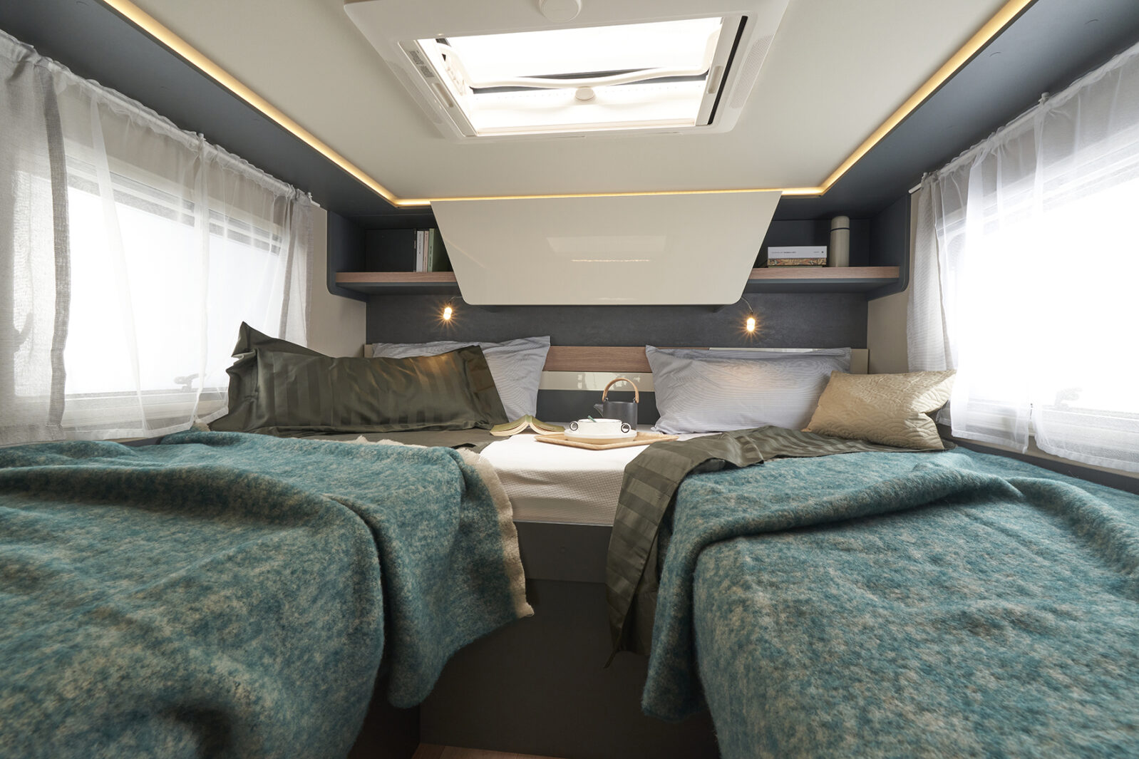 The control panel of the system, as mentioned, is fitted in the entrance area. For example, from here you can control the vehicle LED lighting, echoing the diffuse lighting concept introduced with the Kreos. Multi-level light sources line the entire compartment; combined with integrated ceiling and under-wall unit elements they create a pleasant and relaxed setting. There are, of course, USB sockets (12 and 220 V), garage lighting and exterior LED light.